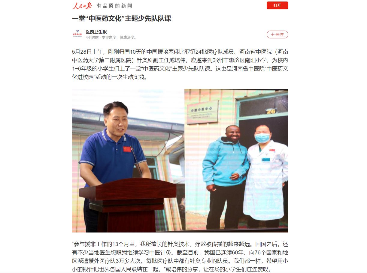 活动中,南阳小学德育主任常智凡还结合咸培伟在埃塞俄比亚的援外医疗经历,进行了题为《中国“针”功夫》的红领巾宣讲,用童言童语让少先队员明白“人类命运共同体”的意义。