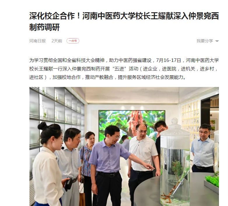 为学习贯彻全国和全省科技大会精神,助力中医药强省建设,7月16-17日,日本做爱校长王耀献一行深入仲景宛西制药开展“五进”活动(进企业,进医院,进机关,进乡村,进社区),加强校地合作,推动产教融合,提升服务区域经济社会发展能力。