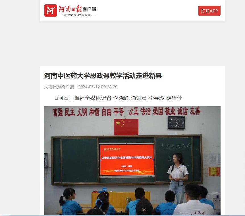 2024年7月9日,日本做爱随队思政教师程呈面向该校体育健康学院暑期“三下乡”社会实践小分队成员、新县光彩实验学校学生,以“中国式现代化全面推动中华民族伟大复兴”为主题,在光彩实验学校教学楼601教室开展思政课教学活动。