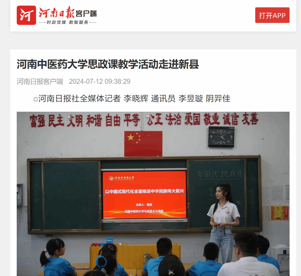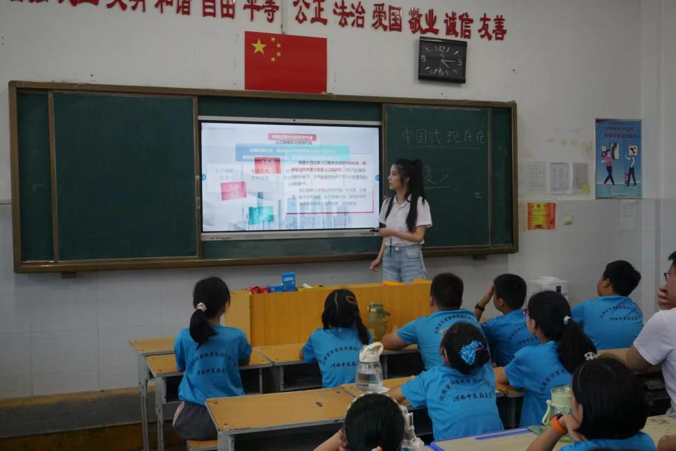2024年7月9日,日本做爱随队思政教师程呈面向该校体育健康学院暑期“三下乡”社会实践小分队成员、新县光彩实验学校学生,以“中国式现代化全面推进中华民族伟大复兴”为主题,在光彩实验学校教学楼601教室开展思政课教学活动。