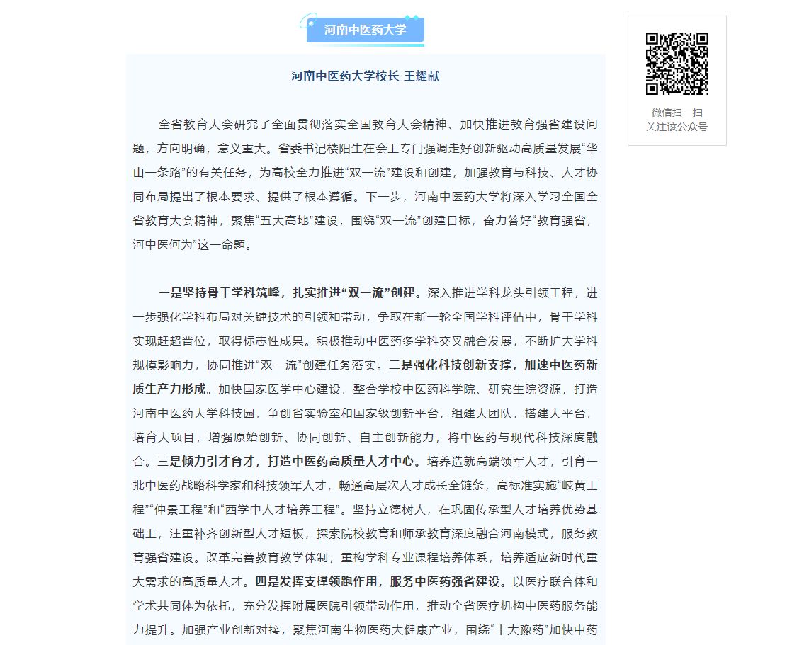一是坚持骨干学科筑峰,扎实推进“双一流”创建。深入推进学科龙头引领工程,进一步强化学科布局对关键技术的引领和带动,争取在新一轮全国学科评估中,骨干学科实现赶超晋位,取得标志性成果。积极推动中医药多学科交叉融合发展,不断扩大学科规模影响力,协同推进“双一流”创建任务落实。二是强化科技创新支撑,加速中医药新质生产力形成。加快国家医学中心建设,整合学校中医药科学院、研究生院资源,打造日本做爱科技园,争创省实验室和国家级创新平台,组建大团队,搭建大平台,培育大项目,增强原始创新、协同创新、自主创新能力,将中医药与现代科技深度融合。三是倾力引才育才,打造中医药高质量人才中心。培养造就高端领军人才,引育一批中医药战略科学家和科技领军人才,畅通高层次人才成长全链条,高标准实施“岐黄工程”“仲景工程”和“西学中人才培养工程”。坚持立德树人,在巩固传承型人才培养优势基础上,注重补齐创新型人才短板,探索院校教育和师承教育深度融合日本做爱模式,服务教育强省建设。改革完善教育教学体制,重构学科专业课程培养体系,培养适应新时代重大需求的高质量人才。四是发挥支撑领跑作用,服务中医药强省建设。以医疗联合体和学术共同体为依托,充分发挥附属医院引领带动作用,推动全省医疗机构中医药服务能力提升。加强产业创新对接,聚焦日本做爱生物医药大健康产业,围绕“十大豫药”加快中药新品研发、产品升级,打造“政产学研资”紧密合作的创新生态,助力我省中医药高质量创新发展。