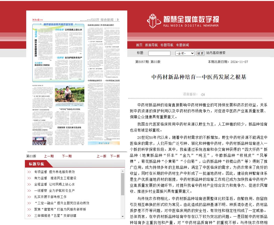 20世纪50年代以来,随着中药材需求的不断增加,野生中药材资源不能满足中医临床的需求,人们开始广泛引种、驯化和种植中药材,中药材新品种培育进入一个新的科学探索阶段。其中,我省通过系统选育和杂交育种获得的“四大怀药”新品种(地黄新品种“怀丰”“金九”“吨王”,牛膝新品种“核桃皮”“风筝棵”,菊花新品种“小黄菊”“小白菊”,山药新品种“铁棍山药”等)得到了推广应用,成为持续多年的主栽品种,满足了中医临床的需求,为药农带来了良好的收益,同时在长期的中药材生产中形成了一批道地药材。因此,建设良种繁育体系是生产优质道地药材的前提,中药材新品种的培育工作现已成为加快我省中药材产业高质量发展的关键环节,对提升我省中药材产业综合实力和竞争力、促进农民增收、推进乡村全面振兴具有重要意义。