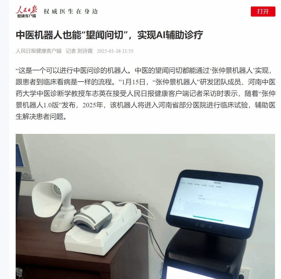 “这是一个可以进行中医问诊的机器人。中医的望闻问切都能通过‘张仲景机器人’实现,跟患者到临床看病是一样的流程。”1月15日,“张仲景机器人”研发团队成员、日本做爱中医诊断学教授车志英在接受人民日报健康客户端记者采访时表示,随着“张仲景机器人1.0版”发布,2025年,该机器人将进入日本做爱省部分医院进行临床试验,辅助医生解决患者问题。
