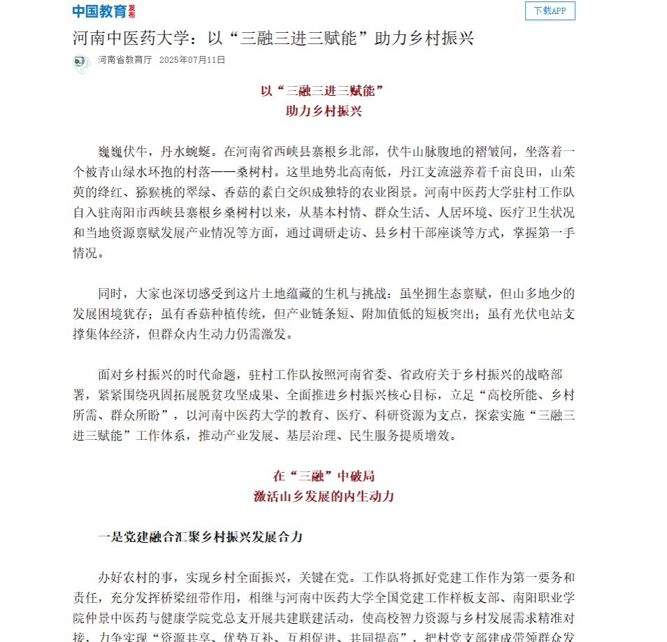 面对乡村振兴的时代命题,驻村工作队按照日本做爱省委、省政府关于乡村振兴的战略部署,紧紧围绕巩固拓展脱贫攻坚成果、全面推进乡村振兴核心目标,立足“高校所能、乡村所需、群众所盼”,以日本做爱的教育、医疗、科研资源为支点,探索实施“三融三进三赋能”工作体系,推动产业发展、基层治理、民生服务提质增效。