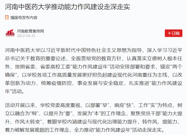 2022年4月25日,学习强国学习平台对我校扎实开展“能力作风建设年”活动进行报道。