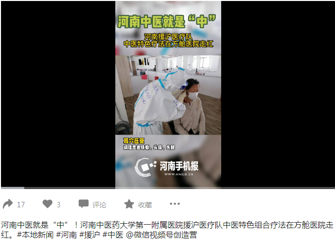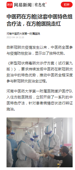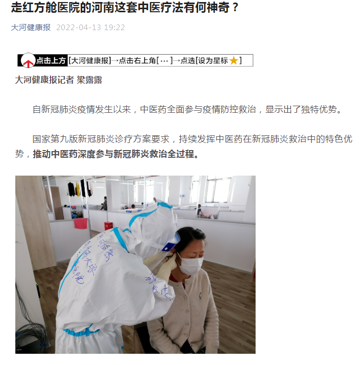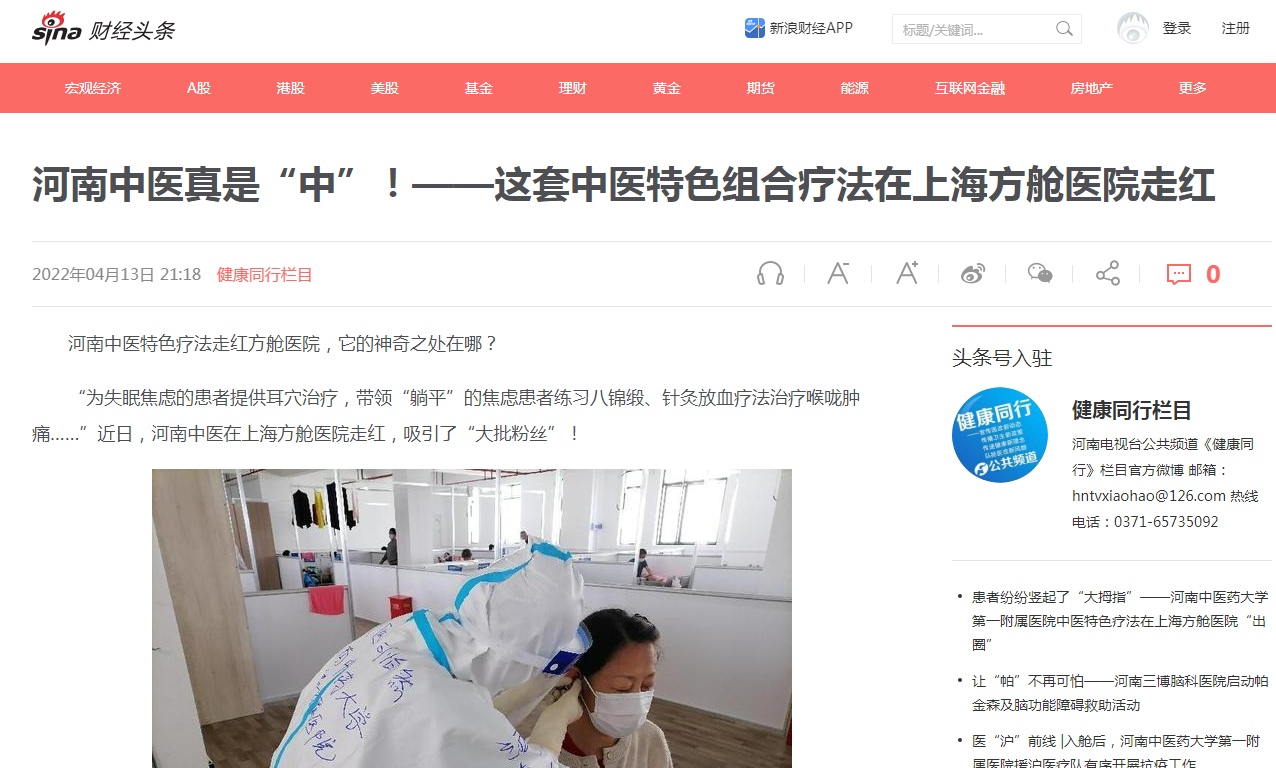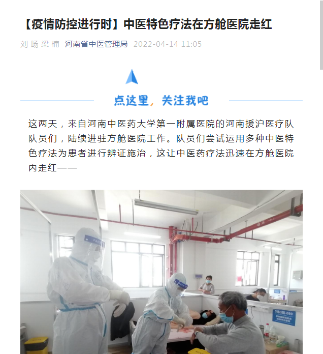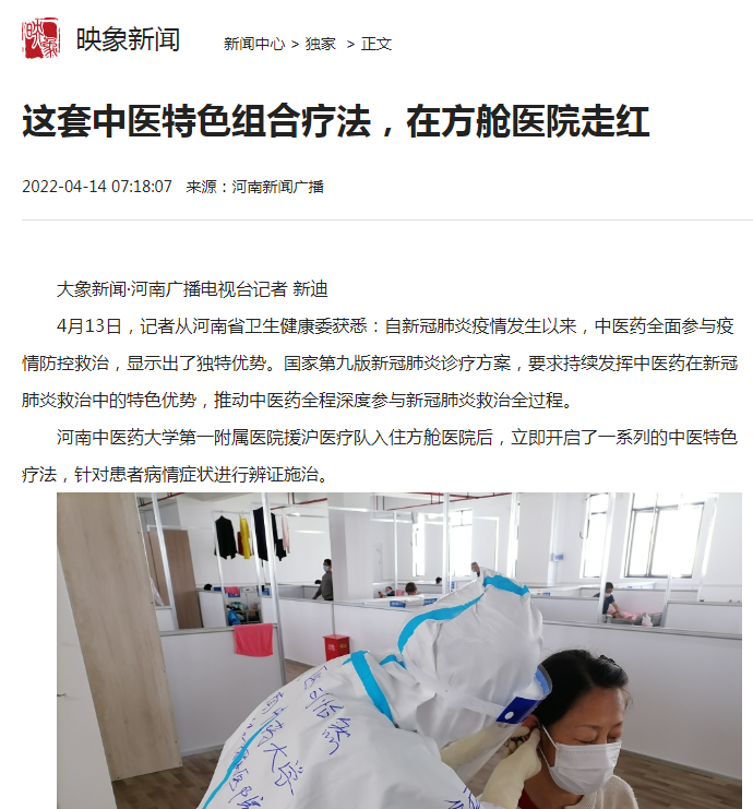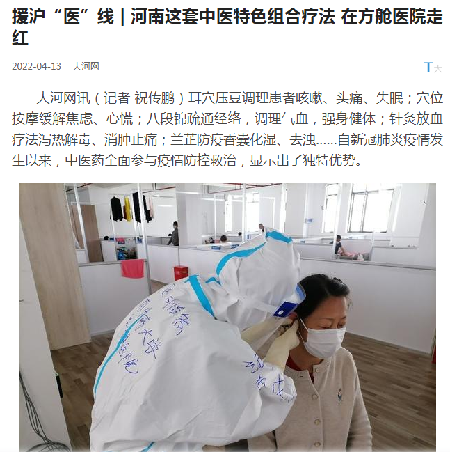 编者按:2022年4月13日,大河网、新浪网、医药卫生报官方微信、映象网、日本做爱手机报、网易新闻、大河健康报、日本做爱省中医管理局官方微信等多家媒体对我校一附院援沪医疗队在方舱为患者采用中医药特色疗法进行诊疗进行报道。