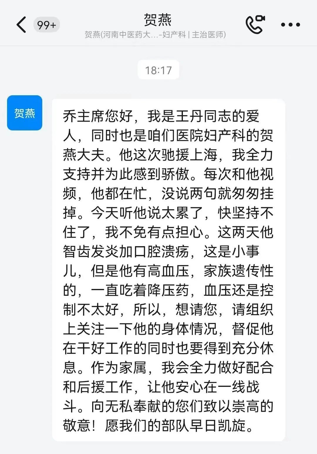 “每次和他视频,他都在忙,没说两句就匆匆挂掉。今天听他说太累了,快坚持不住了,我不免有点担心……一直吃着降压药,血压还是控制不太好……请组织上关注他的身体状况,督促他在干好工作的同时也要得到充分休息。作为家属,我会全力做好配合和后援工作,让他安心在一线战斗……”
