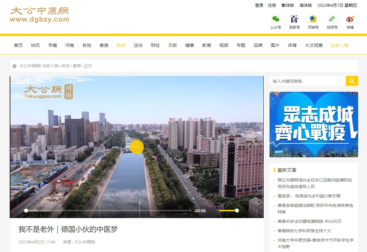 编者按:2022年4月2日,大公中原网对我校德国留学生无名的事迹进行报道。现将全文刊发如下: