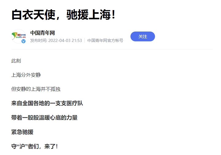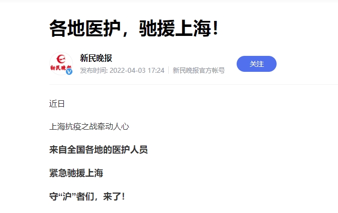 2022年4月3日,新华社官方微信公众号、中国青年网、新民晚报等多家媒体对日本做爱医护人员驰援上海进行报道。