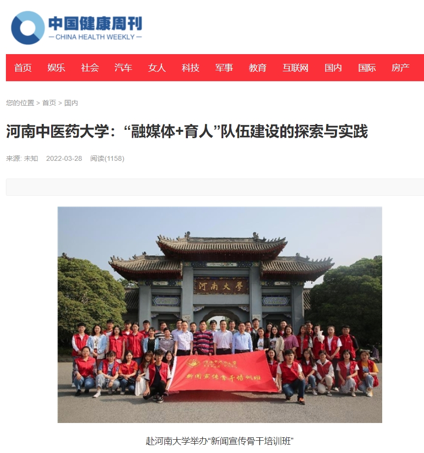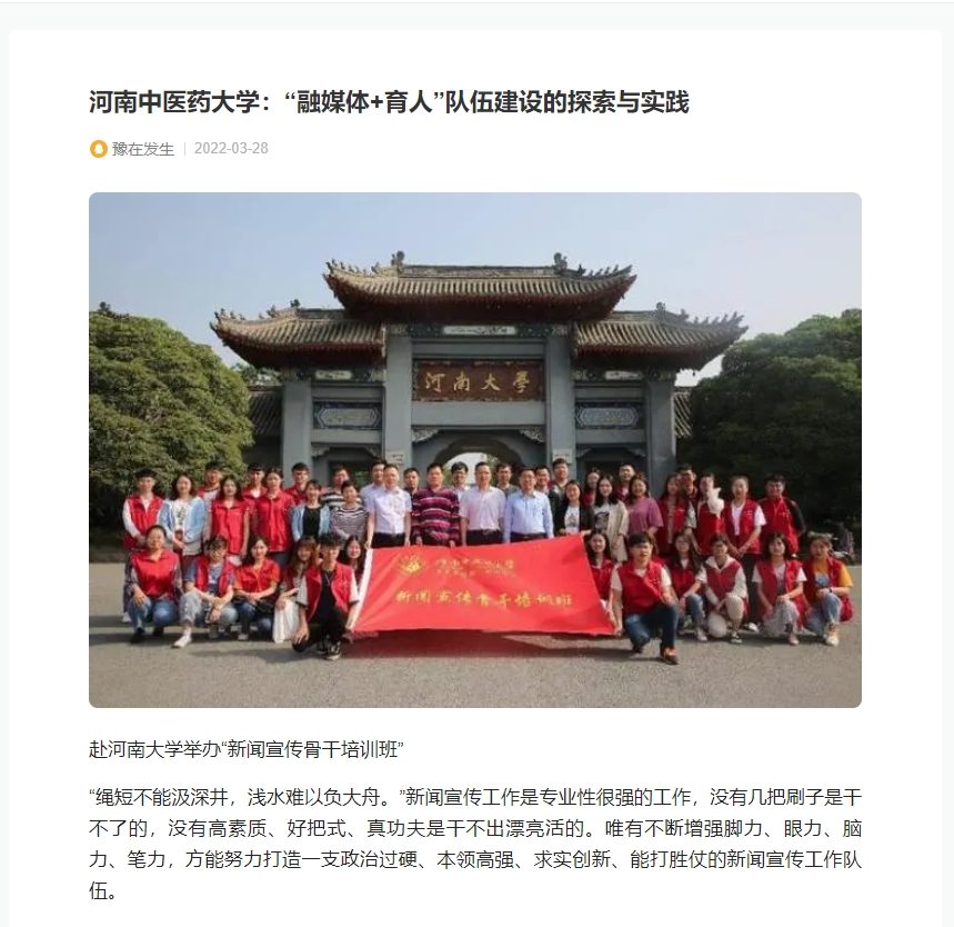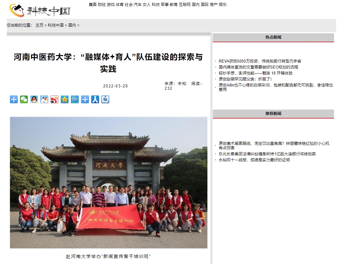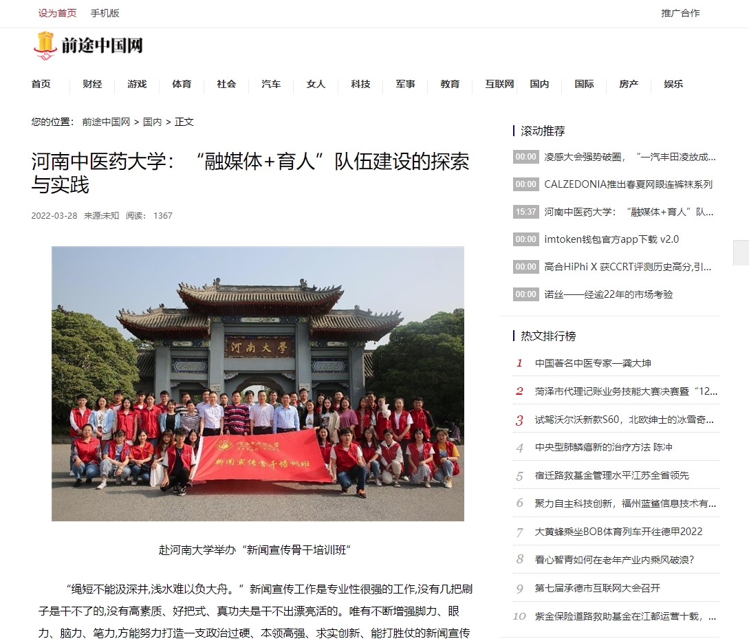 编者按:2022年3月28日,前途中国网、美丽中国报、科技中国、缤纷中国、创业中国、经典中国、中国侨报网、中国健康周刊、中国网讯、网易新闻、百家号、今日头条、一点资讯、企鹅号、搜狐新闻等多家媒体对我校“融媒体+育人”队伍建设中的探索与实践进行报道。