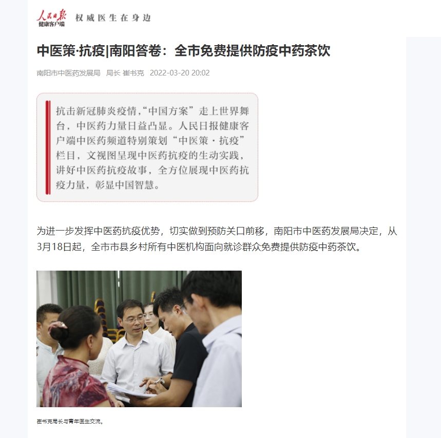 编者按:2022年3月20日,人民日报健康客户端对南阳全市所有中医机构免费提供防疫中药茶饮进行报道。现将全文刊发如下: