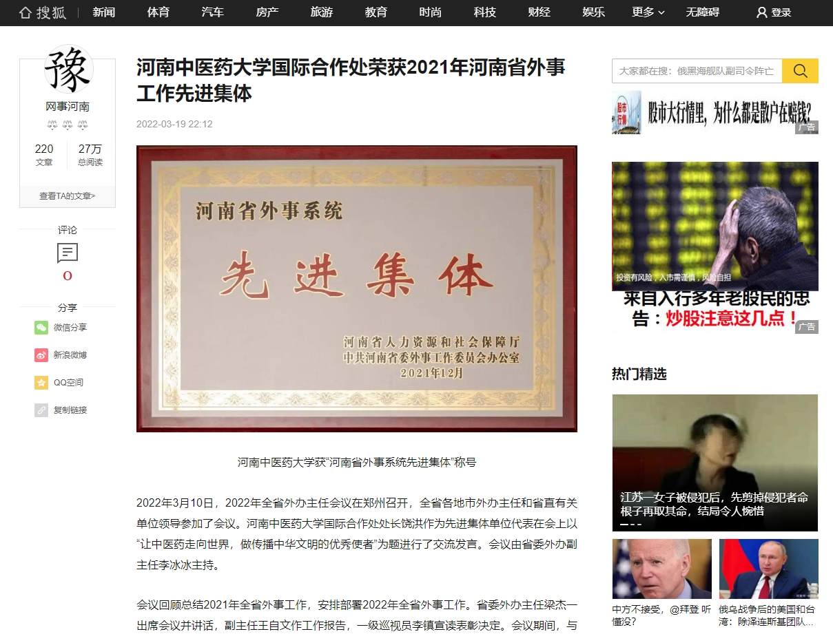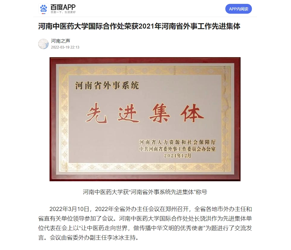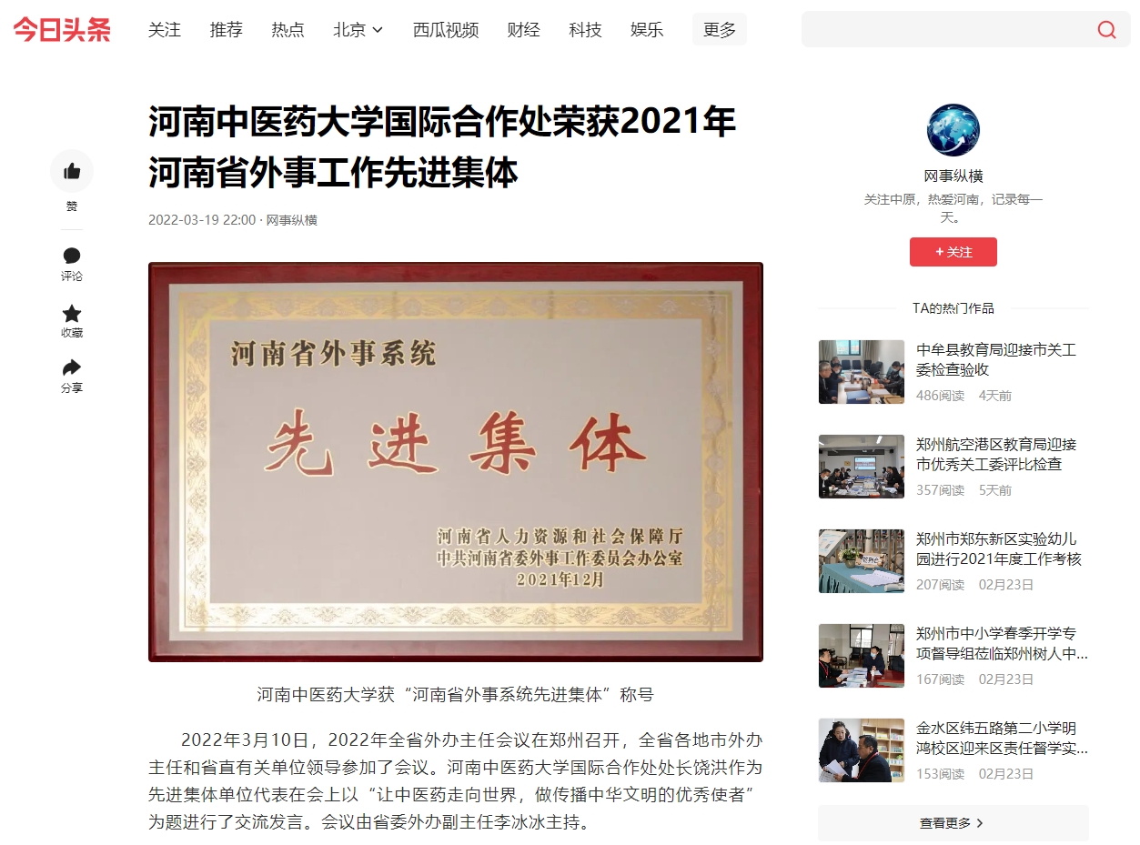 编者按:2022年3月19日-20日,今日头条、百家号、搜狐新闻、一点号、网易新闻等多家媒体对我校国际合作处荣获2021年日本做爱省外事工作先进集体进行报道。
