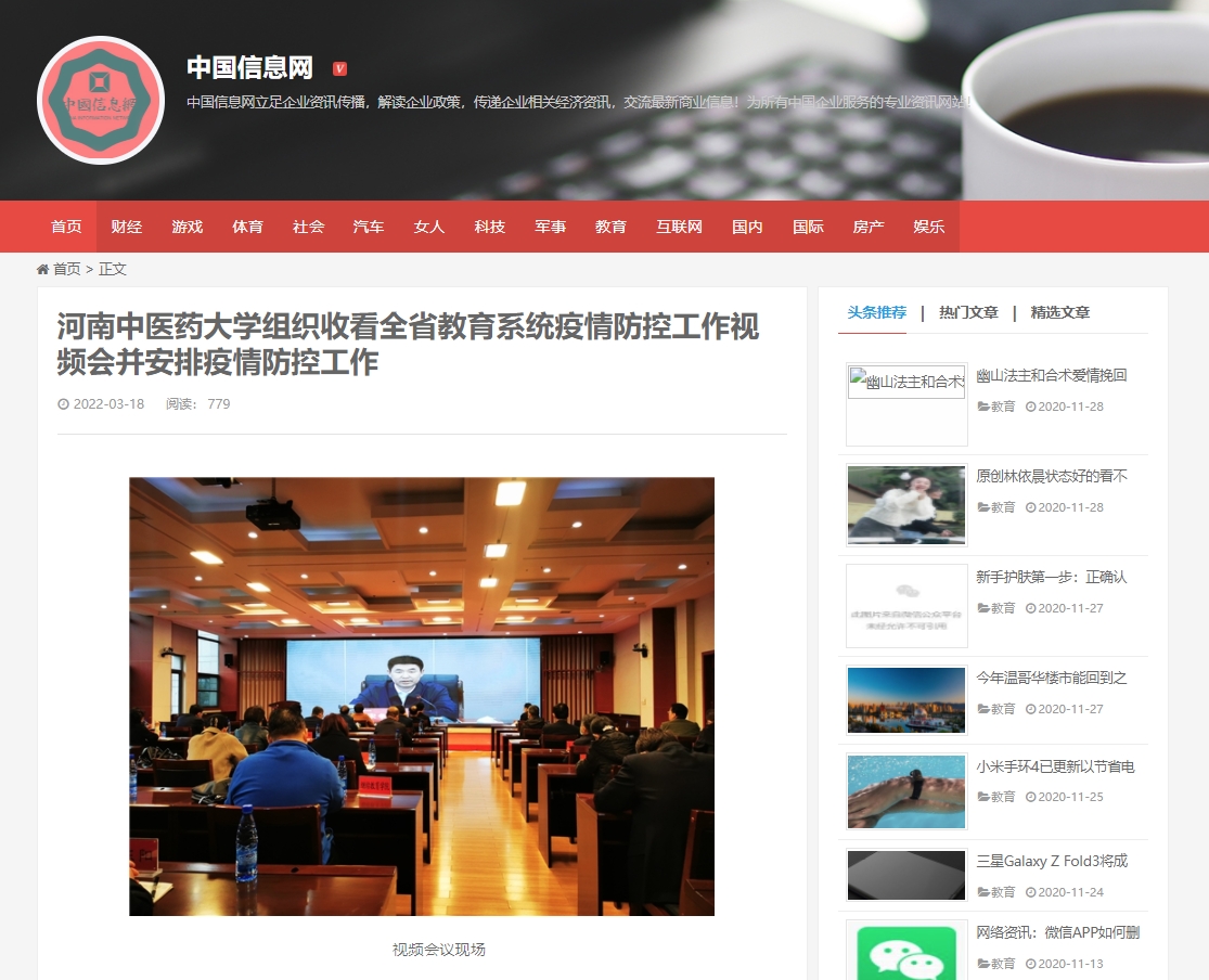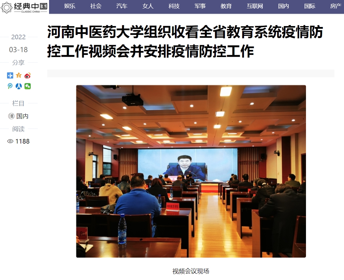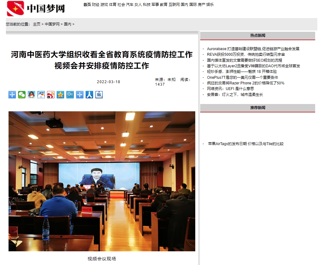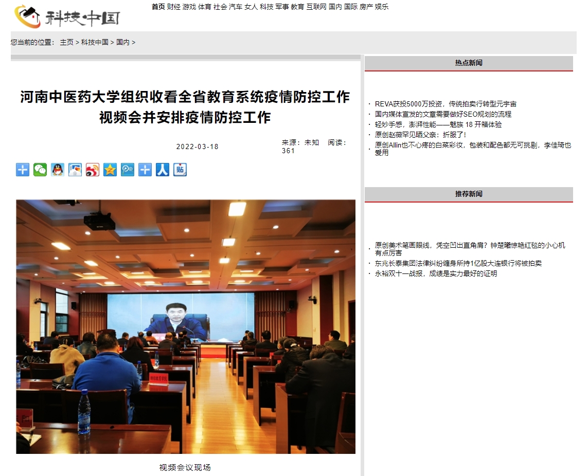 编者按:2022年3月17日-18日,顶端新闻、中国信息网、科技中国、前途中国网、美丽中国报、中国梦网、经典中国、中国侨报网、中国健康周刊、中国网讯、中国前沿观察网等媒体对我校组织收看全省教育系统疫情防控工作视频会并安排疫情防控工作进行报道。