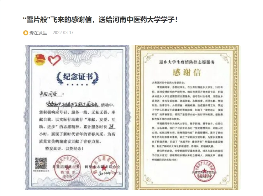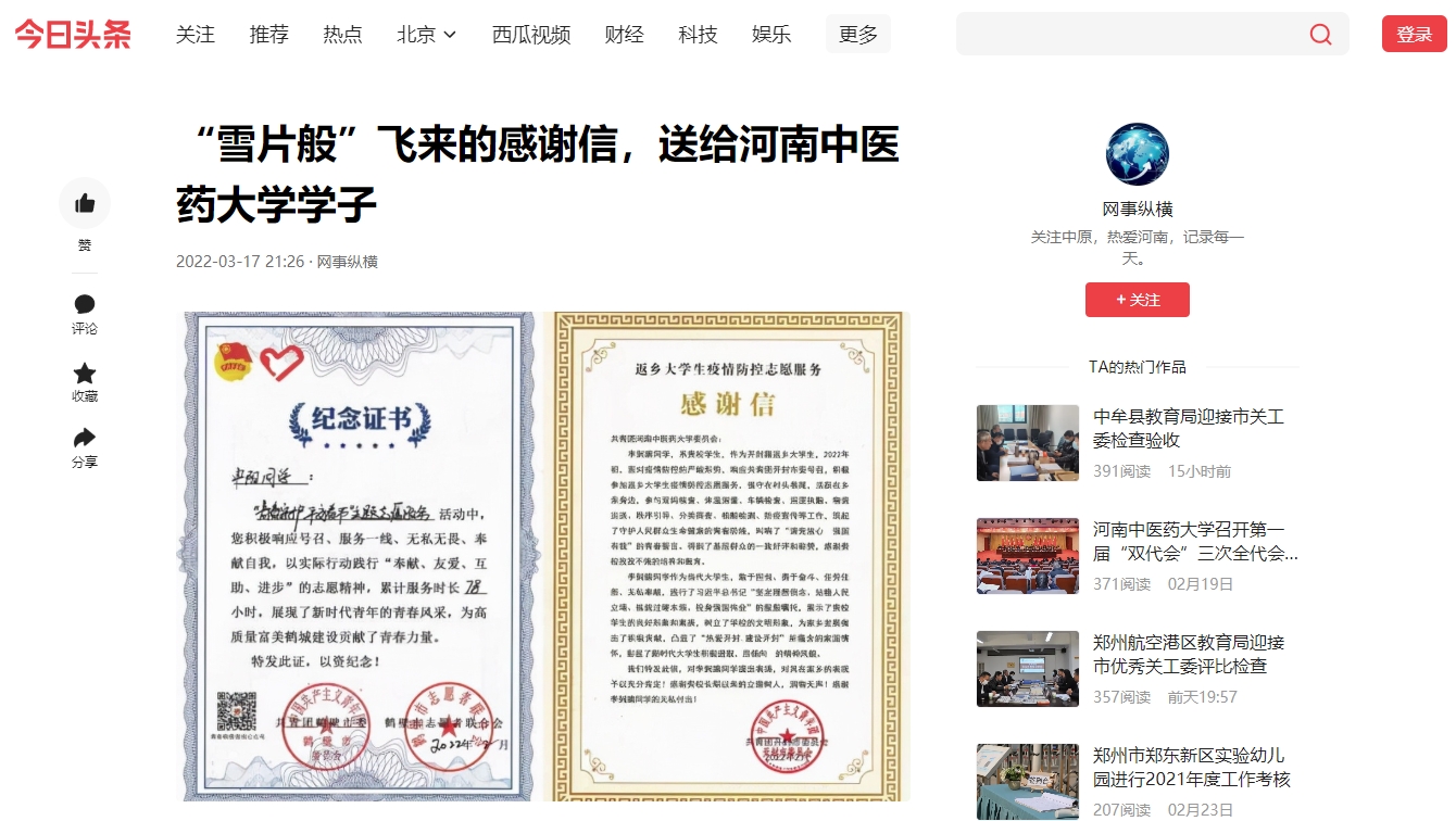 编者按:2022年3月17日,搜狐新闻、今日头条、腾讯内容开放平台、一点号对我校洛阳平乐正骨学院陆续收到多封来自各级团组织、街道、社区的感谢信及表扬信进行报道。