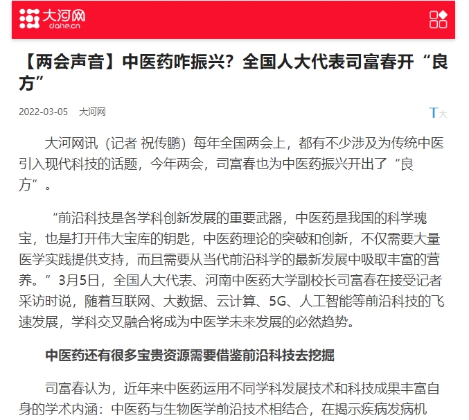 编者按:2022年3月5日,大河网对全国人大代表、我校副校长司富春为中医药振兴建言献策进行报道。现将全文刊发如下: