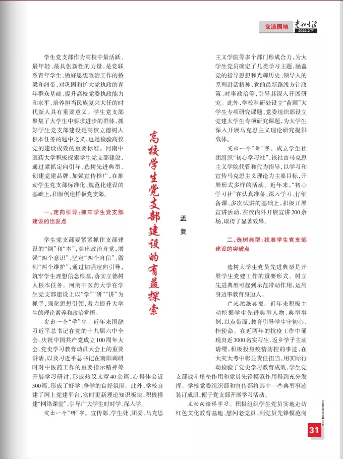 编者按:近日,《党的生活》杂志刊发我校马克思主义学院副研究馆员孟复的文章《高校学生党支部建设的有益探索》,现将全文刊发如下: