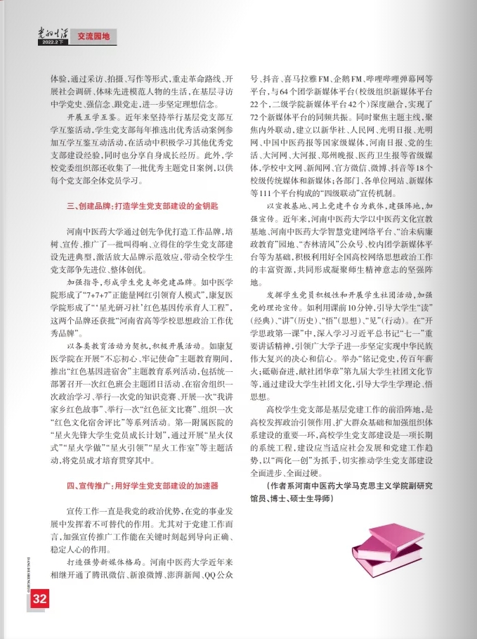 突出一个“学”字。学生党支部近年来围绕习近平总书记在党的十九届六中全会、庆祝中国共产党成立100周年大会、党史学习教育动员大会上的重要讲话,以及习近平总书记在南阳调研时对中医药工作的重要指示精神等开展学习研讨,形成热议40余篇,心得体会近500篇,形成了好学、争学的良好氛围。此外,学校自建了网上党建平台,实时更新理论知识板块,积极搭建“网络课堂”,引导广大学生时时学、深入学。