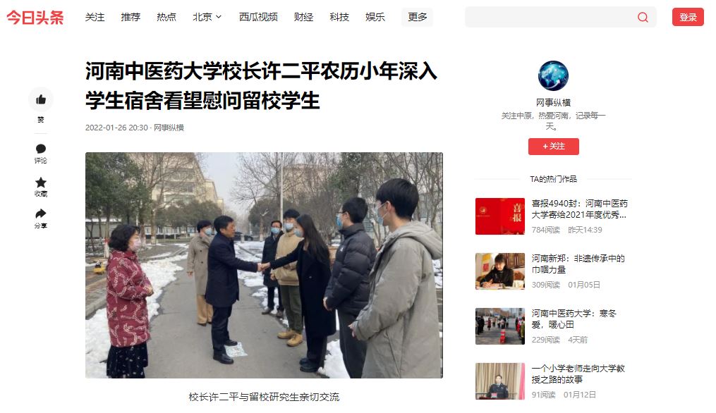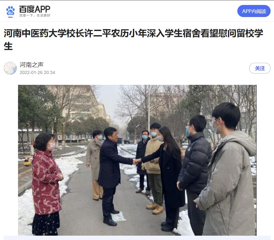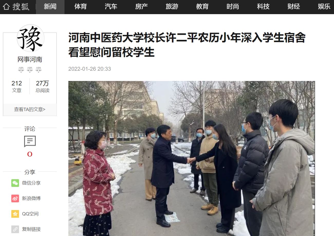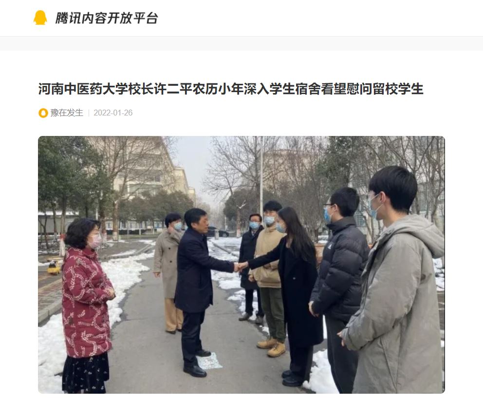2022年1月26日,今日头条、百家号、搜狐号、腾讯内容开放平台对我校校长许二平农历小年深入学生宿舍看望慰问留校学生进行报道。