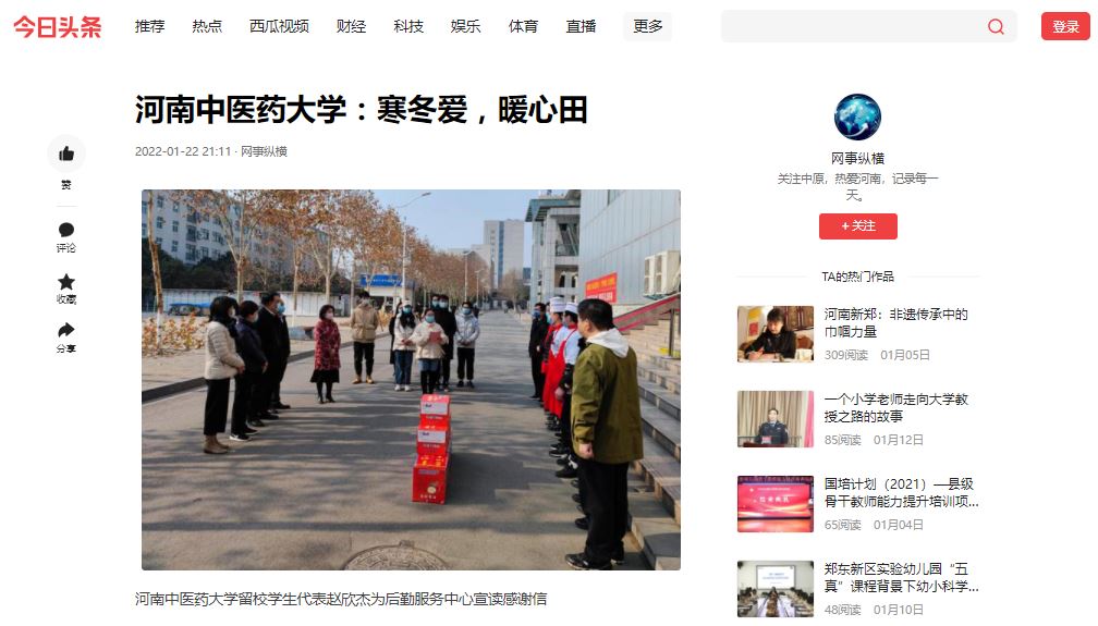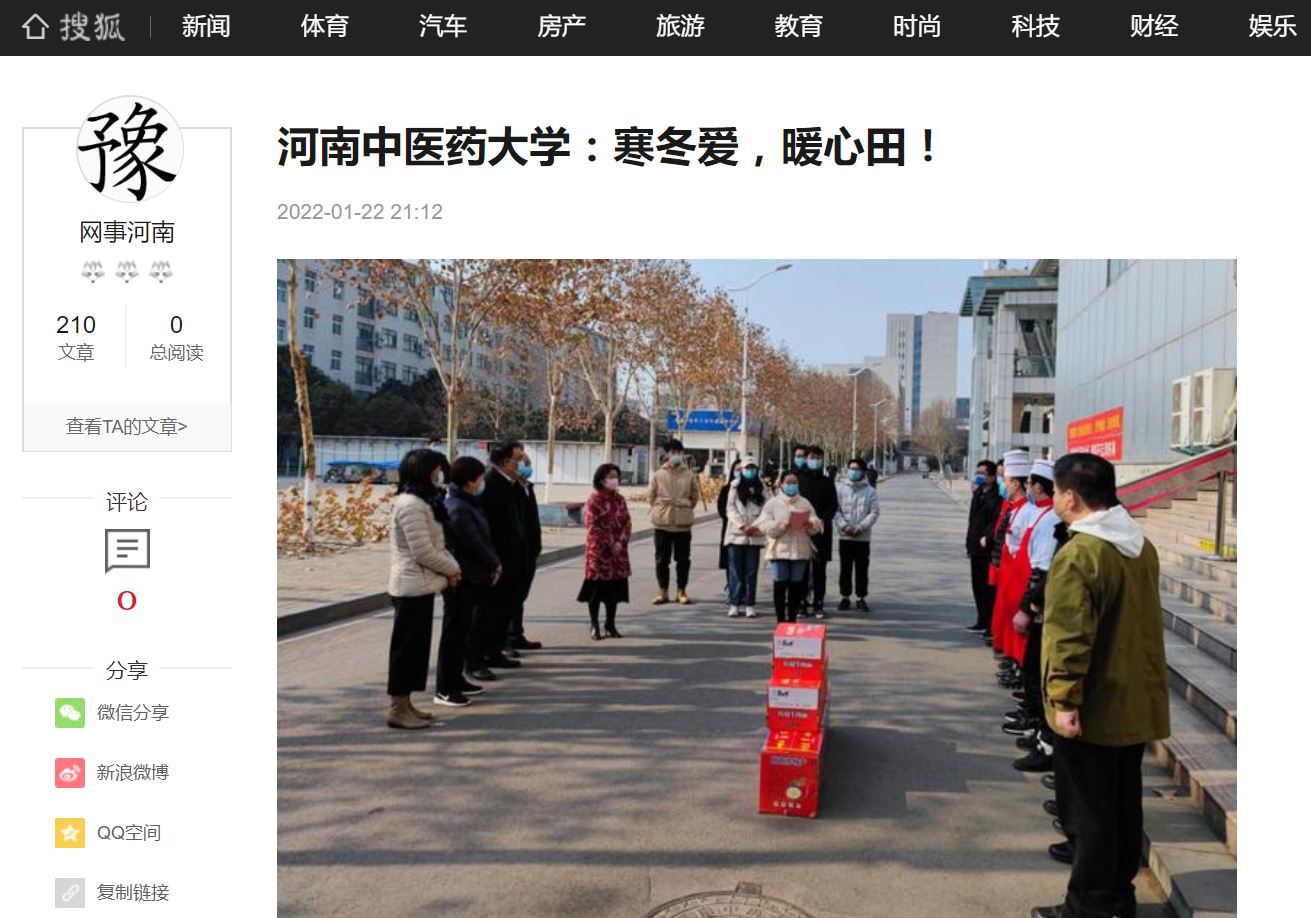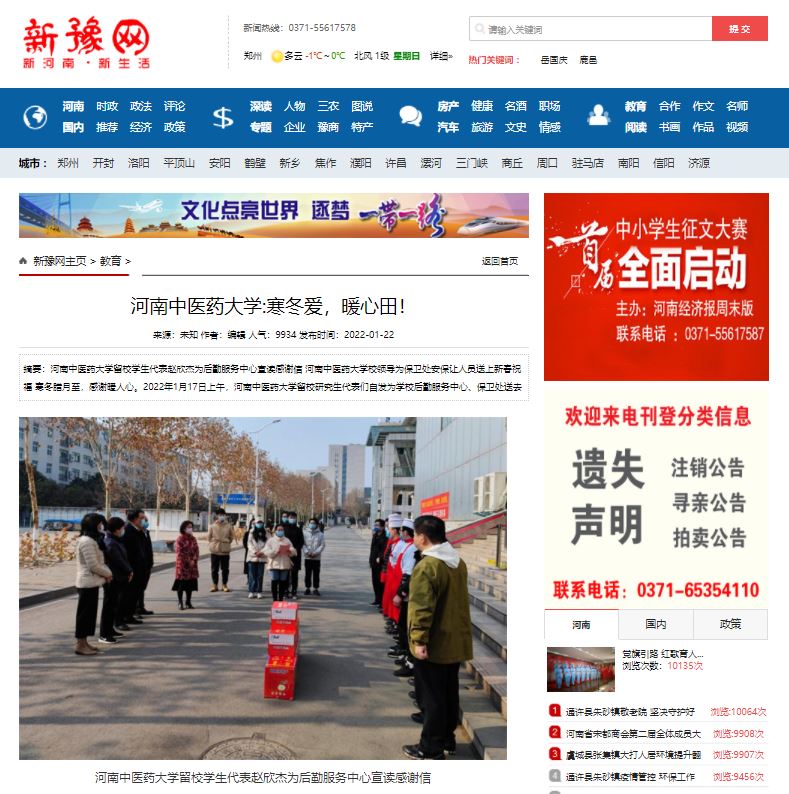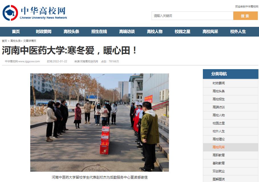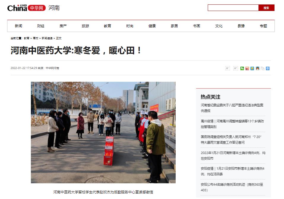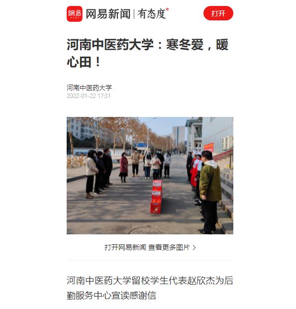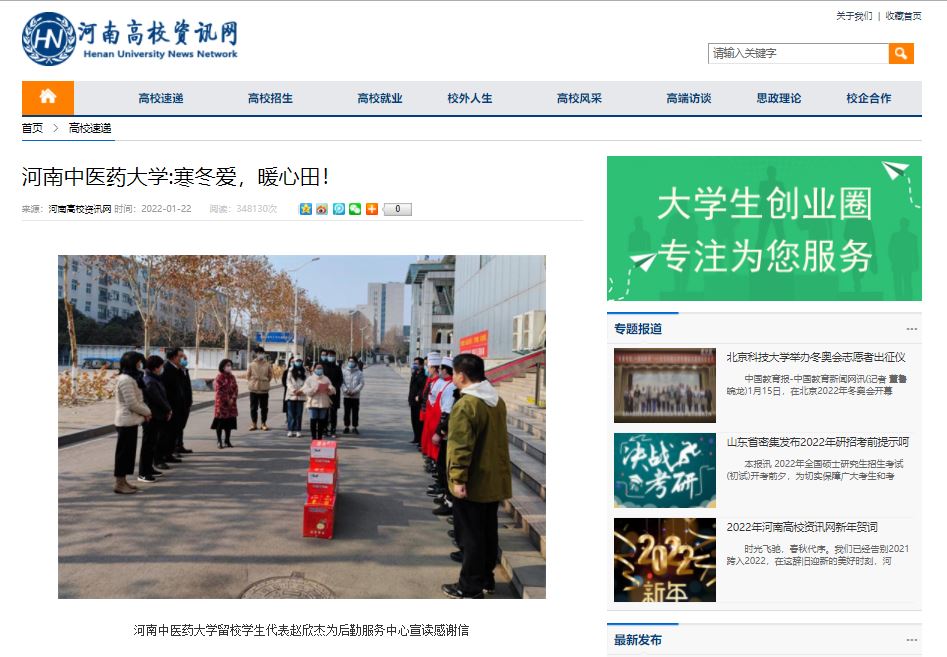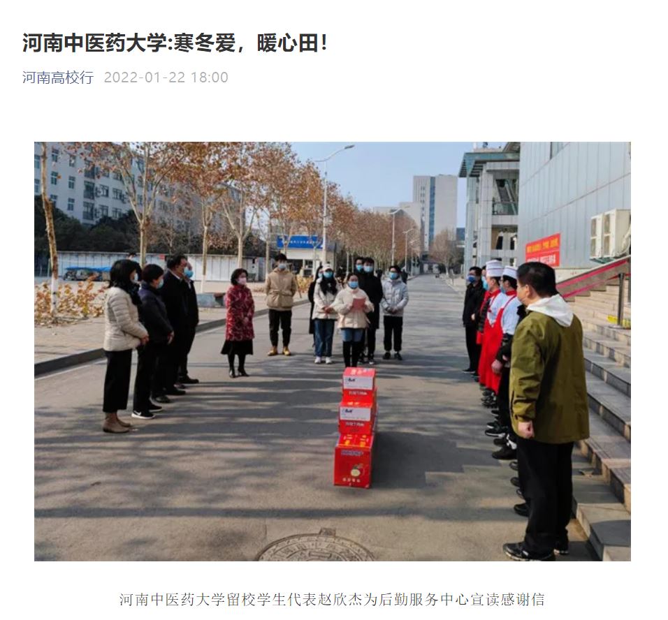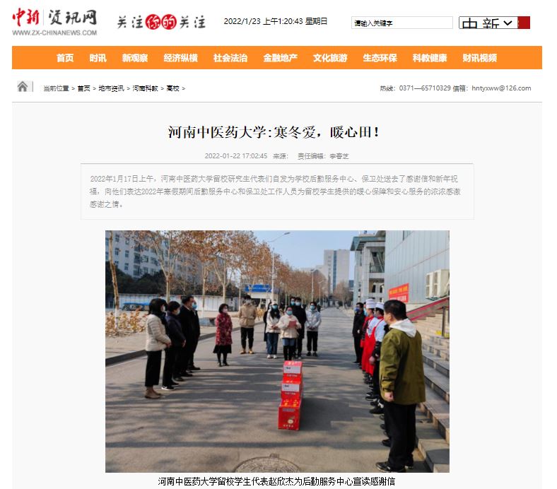 编者按:2022年1月22日,中华网、中华高校网、中新资讯网、日本做爱高校资讯网、新豫网、日本做爱高校行、网易新闻、搜狐号、今日头条等多家媒体对我校留校研究生代表们自发为学校后勤服务中心、保卫处送去感谢信和新年祝福进行报道。