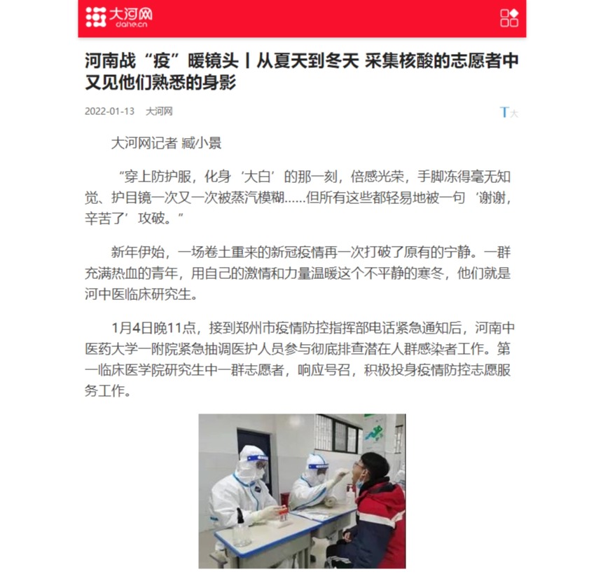 编者按:2022年1月13日,大河网对我校第一临床医学院研究生志愿者响应号召,积极投身疫情防控志愿服务工作进行报道。现将全文刊发如下: