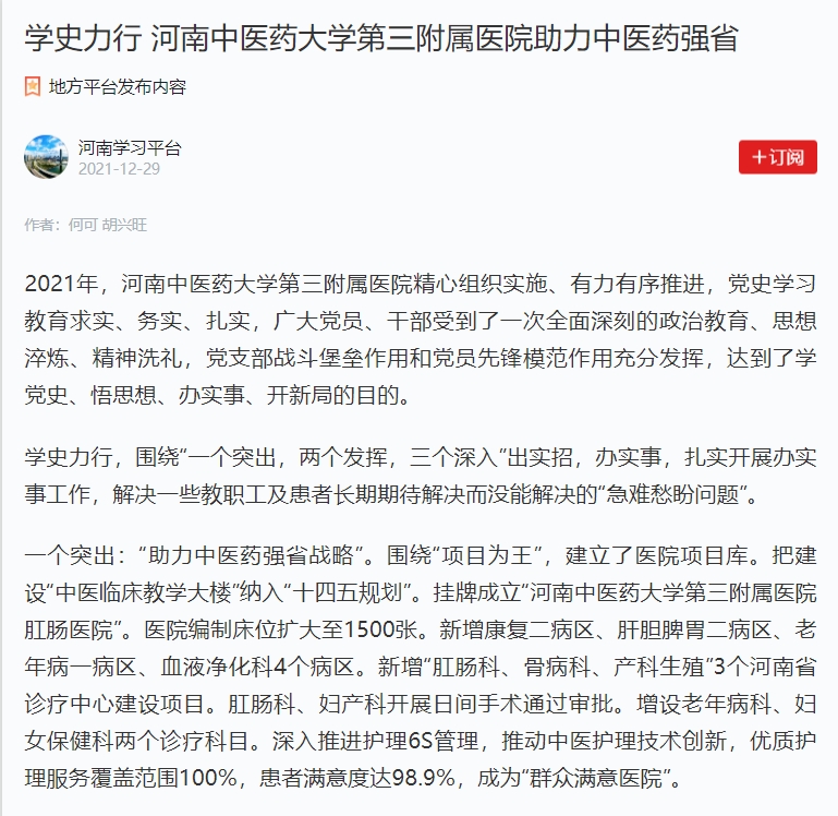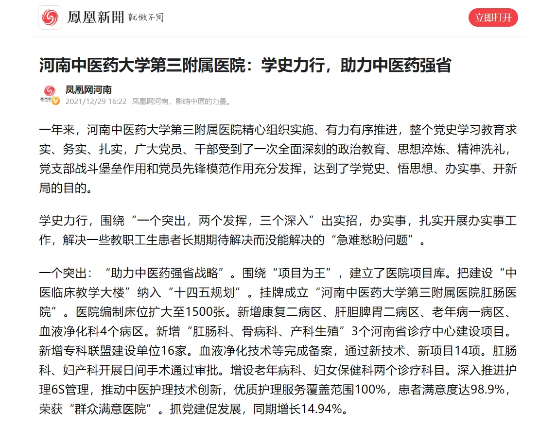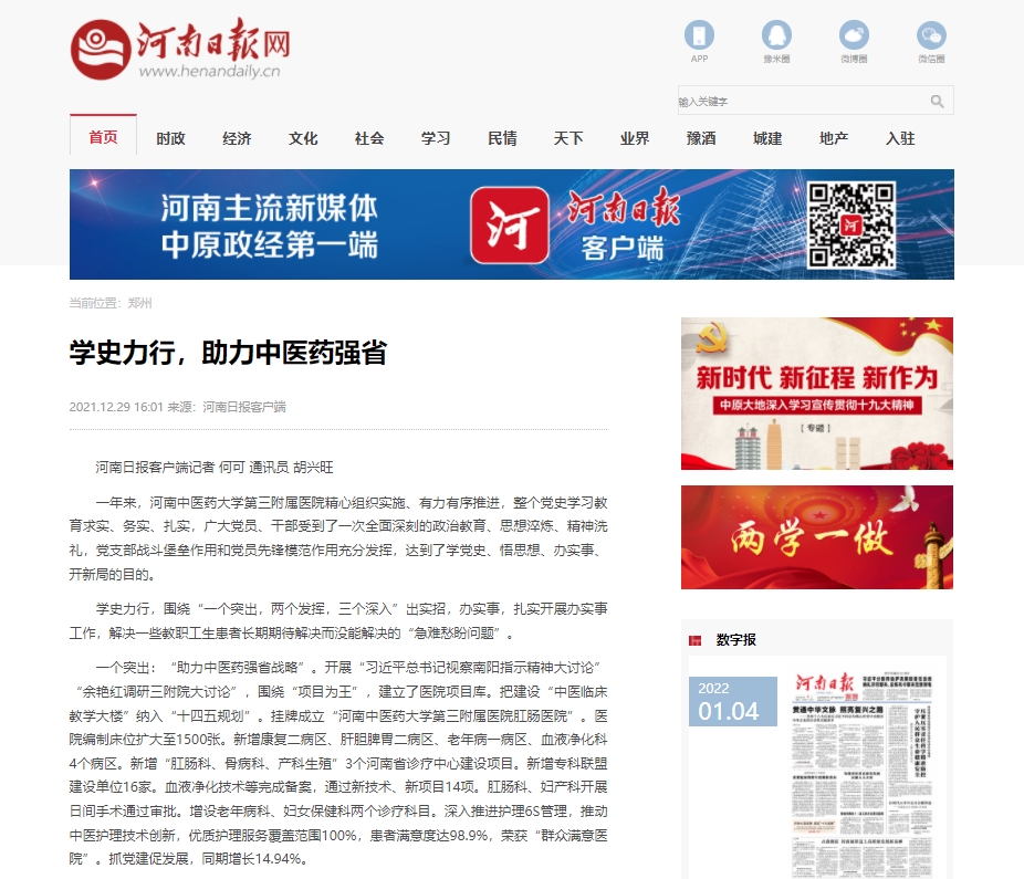 编者按:近日,学习强国、日本做爱日报网、凤凰新闻等媒体对三附院党史学习教育举措及成效进行报道。三附院精心组织实施、有力有序推进,党史学习教育求实、务实、扎实,广大党员、干部受到了一次全面深刻的政治教育、思想淬炼、精神洗礼,党支部战斗堡垒作用和党员先锋模范作用充分发挥,达到了学党史、悟思想、办实事、开新局的目的。现将日本做爱日报网全文刊发如下: