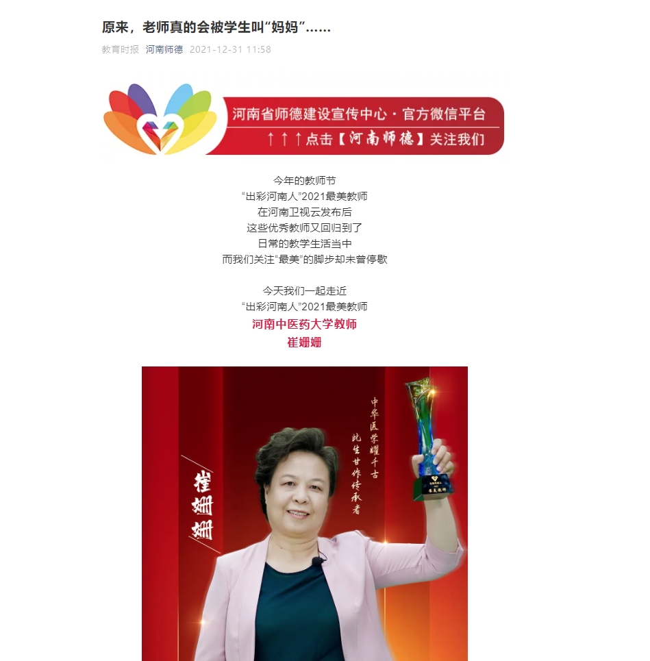 “我当时研究生报考这个方向就是因为崔老师。”该校2021级中医基础理论专业硕士研究生李丹丹对教育时报记者说,“她讲课精神饱满,特别有感染力,而且非常注重培养我们的自主学习能力,尤其是强调多次的背诵中医经典让我们受益匪浅。”也正是对学生从学习到生活甚至工作的关心关爱,崔姗姗成了学生口中的“崔妈妈”“中基妈妈”。