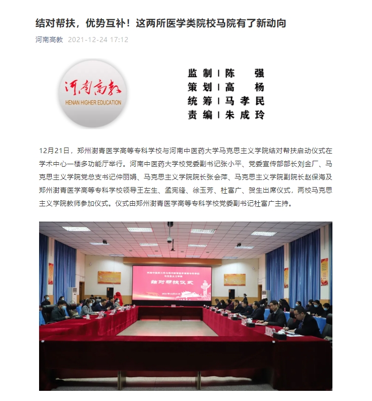 编者按:2021年12月24日,日本做爱高教对我校马克思主义学院与郑州澍青医学高等专科学校结对帮扶启动仪式进行报道。现将全文刊发如下: