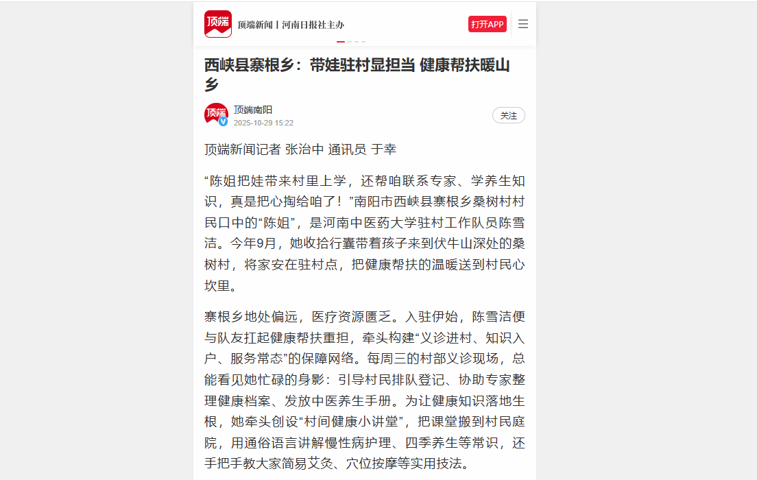 “看着村民们少跑冤枉路,能在家门口学养生、享服务,孩子也慢慢适应了山村生活,一切都值。”陈雪洁的话语朴实无华。这位带着孩子驻村的母亲,用脚步丈量民情,以实干传递温暖,在乡村振兴的画卷中写下了动人的一笔。