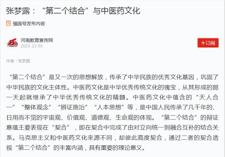 “第二个结合”巩固了中华文化主体性,打开了新的文化空间、造就了新的文化生命体。中医药文化底蕴深厚,早已融入中国人的血脉、融入百姓的饮食起居,具有鲜明的民族特色和永不褪色的时代价值。中医药文化同马克思主义之间有内在亲和性与彼此契合性,我们要把两者融通起来,进一步增强我们的历史自信和文化自信,为中国式现代化建设奠定坚实的文化基础。