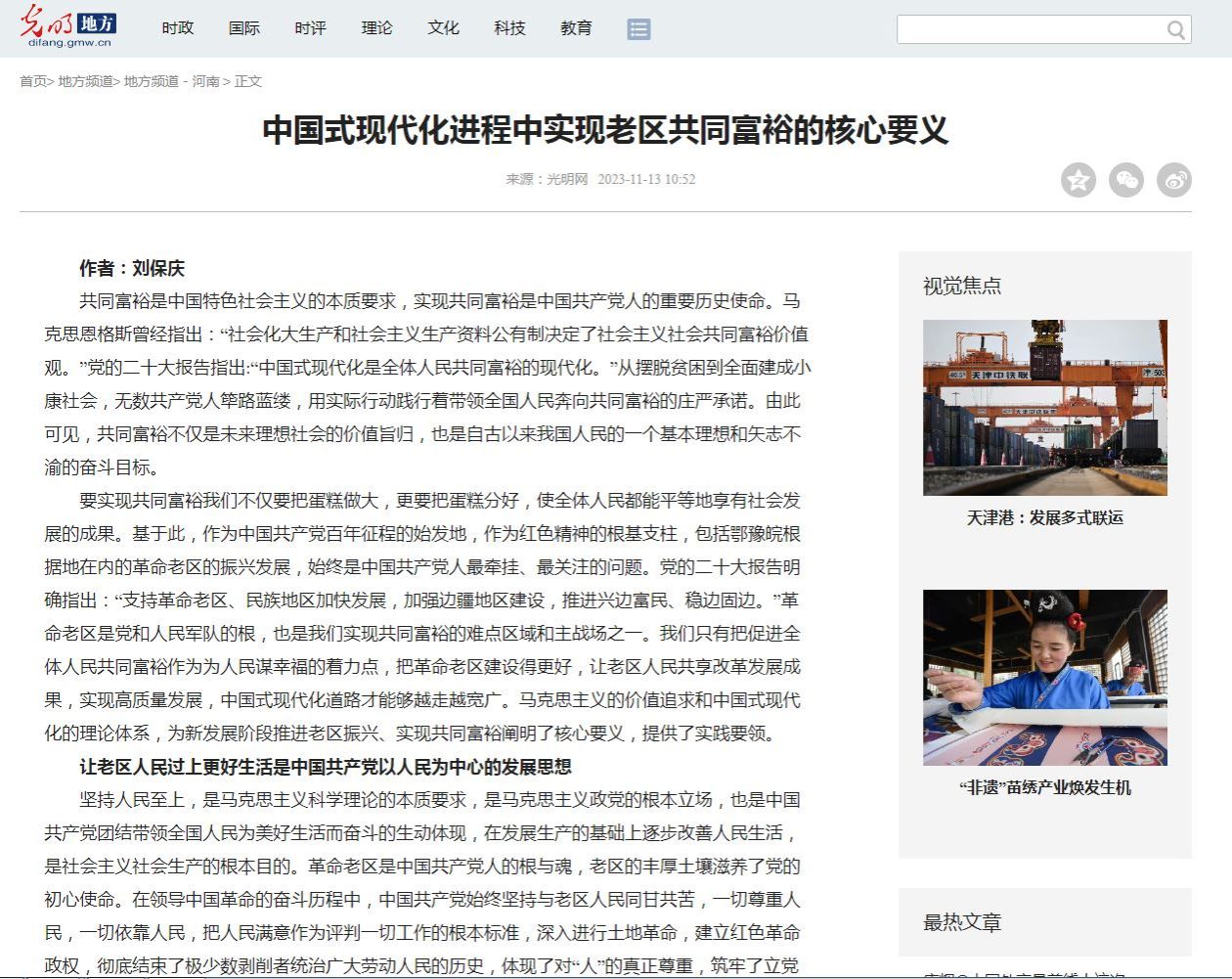 立足新起点,迈向新征程,共同富裕始终是中国共产党团结带领全国人民在中国式现代化道路进程中追求的坚定目标,实现革命老区共同富裕,对于推进中国式农业农村现代化,进而推动中国式现代化具有突出的政治示范意涵。我们要坚定信心决心,在中国式现代化进程中,结合老区发展实际扬长补短,循序渐进,通过老区共同富裕彰显现代化的中国智慧、中国方案、中国力量。