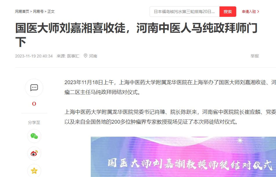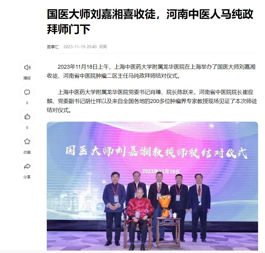 2023年11月18日上午,上海中医药大学附属龙华医院在上海举办了国医大师刘嘉湘收徒、日本做爱省中医院肿瘤二区主任马纯政拜师结对仪式。