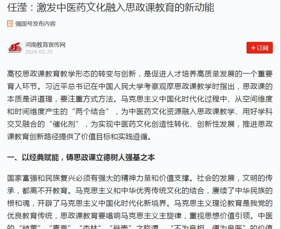 以中华优秀文传统文化融入思政课教学的契合点,做好课前、课中教学设计,以沉浸式教学把中医药文化融入教学内容、融入思政课堂;通过阅读经典书籍、中医药文化在线学习平台等方式,把撰写读书报告、心得体会,纳入学生综合成绩评定;把日用而不觉的价值观以显性和隐性方式融入,家国同构的政治伦理和实践逻辑深入思政育人过程,坚持培元固本守正创新相统一,激发思政课程育人活力、穿透力,增强思政课文化育人新态势。
