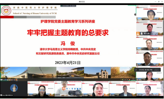 本网讯(文/刘文 图/秦元梅)2023年4月21日,为深入开展学习贯彻习近平新时代中国特色社会主义思想主题教育,护理学院组织全院师生党员开展专题学习培训活动。培训特邀校主题教育第四联络组成员张顺超、李超线上共同观看了清华大学马克思主义学院特聘教授、中共中央党史和文献研究院原院务常委、原中共中央党史研究副主任冯俊讲授的网上公益课程《牢牢把握主题教育的总要求》。