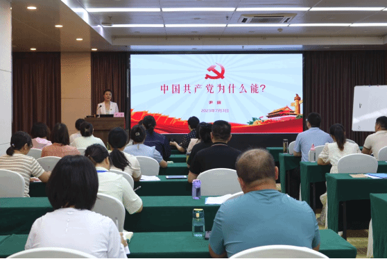 尹丽以《中国共产党为什么能?》为题,向学员们讲述了中国共产党成立至今所取得的辉煌成就,抛出“中国共产党为什么能?”这一问题,并紧紧围绕着中国共产党所具备的十种力量向学员们做出阐释。尹书记指出,中国共产党的信仰力量、理论力量、战略力量、组织力量、人才力量、道义力量、动员力量、纠错力量、净化力量、创新力量这十种力量,鲜明地揭示了“中国共产党为什么能?”。