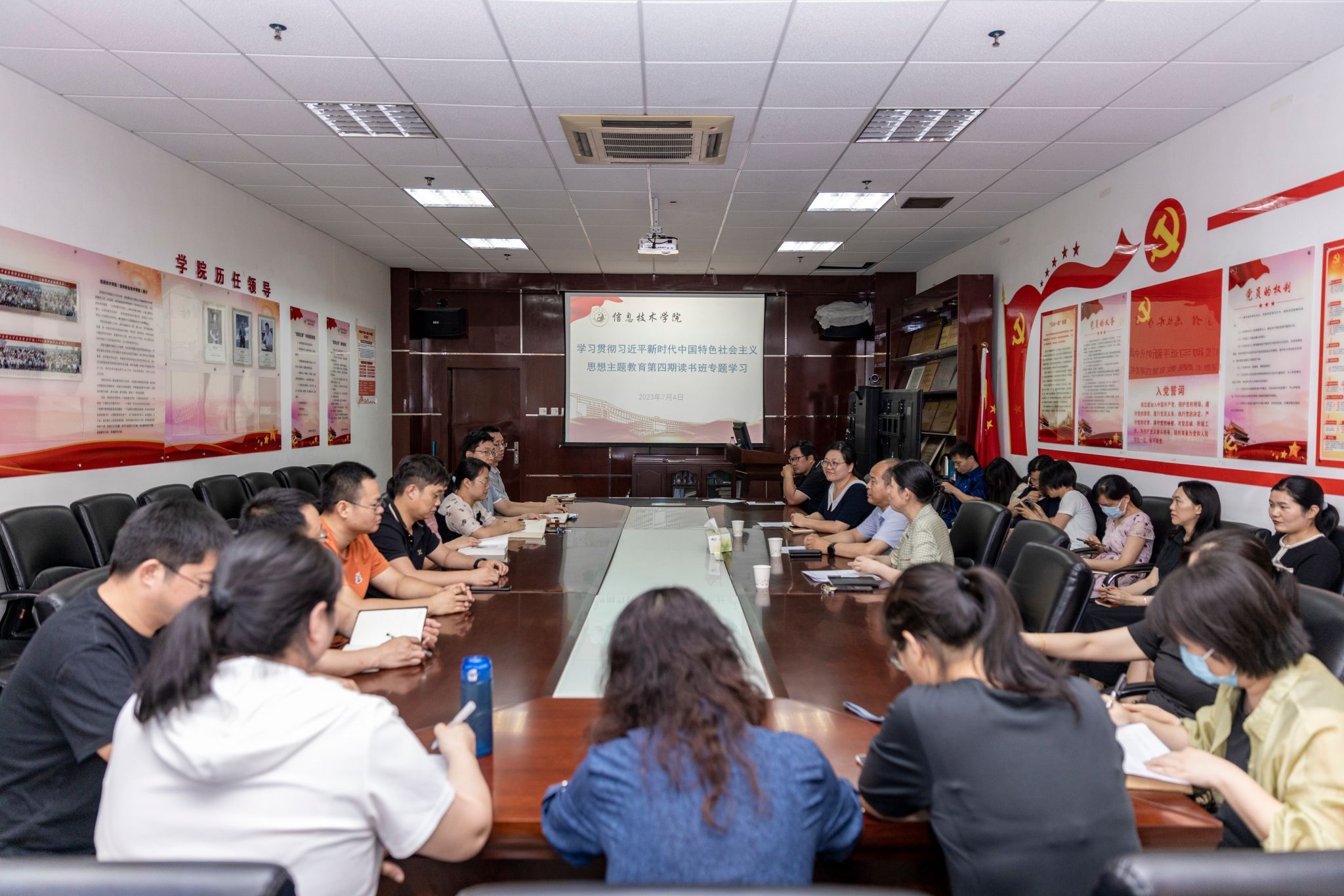 本网讯(文/高海波 图/郭寅虎)2023年7月4日,信息技术学院召开学习贯彻习近平新时代中国特色社会主义思想主题教育第四期读书班专题学习会。校党委委员、副校长苗明三参加并讲授党课,信息技术学院领导班子成员、全院教职工参加。学院党委书记马赟主持会议。