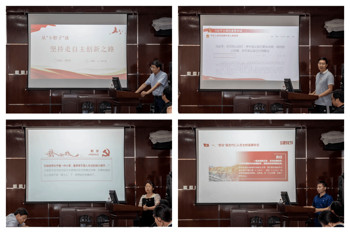 书记讲堂中,教学实验中心党支部书记高志宇以《从卡脖子谈坚持走自主创新之路》为题,讲述共产党人不忘初心使命,靠着独有的自信和担当意识坚持走自主创新之路;信息管理与信息系统党支部书记肖俊生以《共产党人的胸怀》为题,从一道高考作文题切入,谈了自己的认识与体会。党员接力讲环节,教学实验中心党支部闫培玲以《交党费这件事》为题,谈了自己对党费不是一个数字一个规定,而是一种责任一种精神的理解;信息管理与信息系统党支部高海波以《责任比能力更重要》为题,从坚定理想信念、始终勤奋学习、拼搏奋斗、见贤思齐、不畏艰险五方面谈了自己的认识。