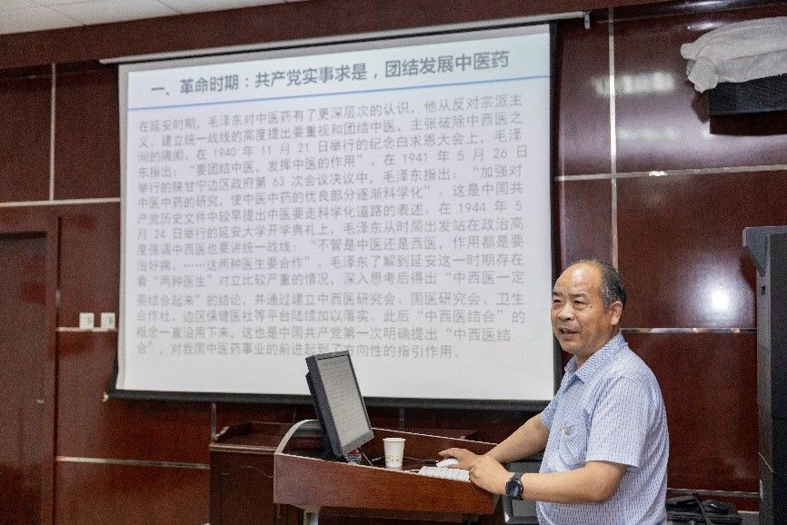 苗明三以《中医药振兴发展重大工程实施方案学习分享》为题,以中国共产党百年党史为轴,梳理了中医药思想形成与发展的历史沿革;从中医药作为卫生资源、经济资源、科技资源、文化资源、生态资源的四大优势和八大工程等方面全方位详细解读了“中医药振兴发展重大工程实施方案”。