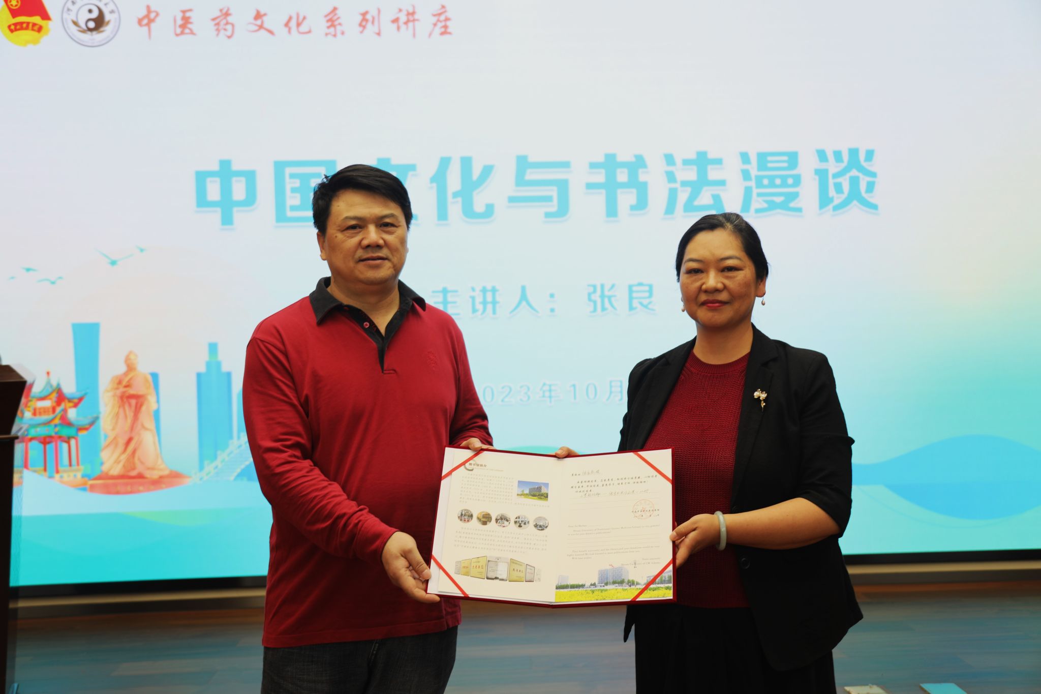 张良从文化与文化自信、中国文字起源与书法的产生发展、中医与书法的关系、各书体代表碑帖及书家简介与学习碑帖的选择、书法创作常用作品形式、书法鉴赏创作与收藏等六个方面,系统梳理了文字书写的发展历程,分析了中医药文化与书法中的相同之处,详细讲述了不同书法流派的特点及代表人物,介绍了鉴赏书法作品的方式和方法,结合个人经验为同学们学习书法提出了中肯的意见和建议。讲座中,张良强调中华优秀传统文化是书法的根基,书法与中医药文化有着密切的联系,当代青年要肩负起文化传承的历史使命,赓续文化血脉,坚定文化自信。