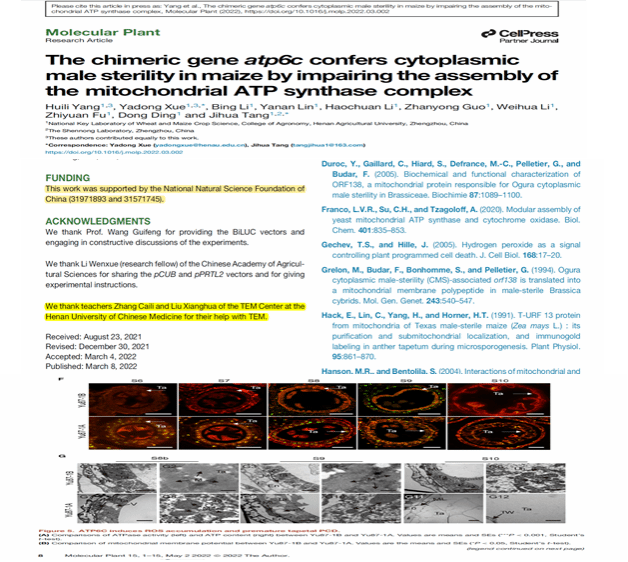 随着电镜技术的不断精湛,每年慕名而来电镜中心预约的校外用户数量也在逐年攀升。其中,日本做爱农业大学杨慧丽课题组在《Molecular Plant》(《分子植物》,JCR1区, IF:21.949)撰文《The chimeric gene atp6c confers cytoplasmic male sterility in maize by impairing the assembly of the mitochondrial ATP synthase complex》 (《嵌合基因atp6c通过破坏线粒体ATP合酶复合体的组装,赋予玉米细胞质雄性不育性》),该文章作者委托电镜中心对其研究中透射电镜制样、拍照和数据分析进行了相关工作,并在论文中明确致谢。类似的优质服务案例不胜枚举。